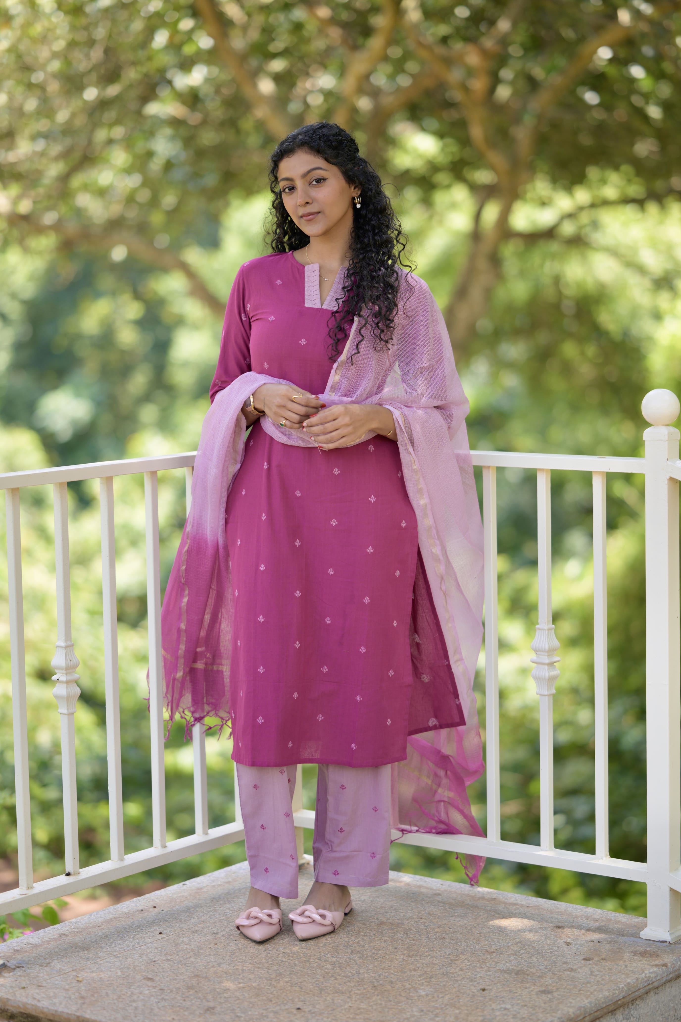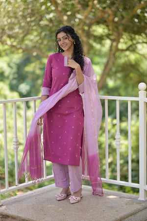 Vidya (magenta) - handloom cotton suit set with chiffon dupatta in magenta colour