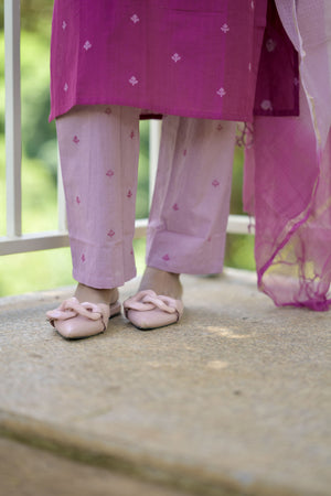 — Pure handloom cotton suit set in a beautiful shade of magenta colour, with smart neckline and sleeves. Pants come with functional pockets. Paired with a chiffon dupatta with borders.