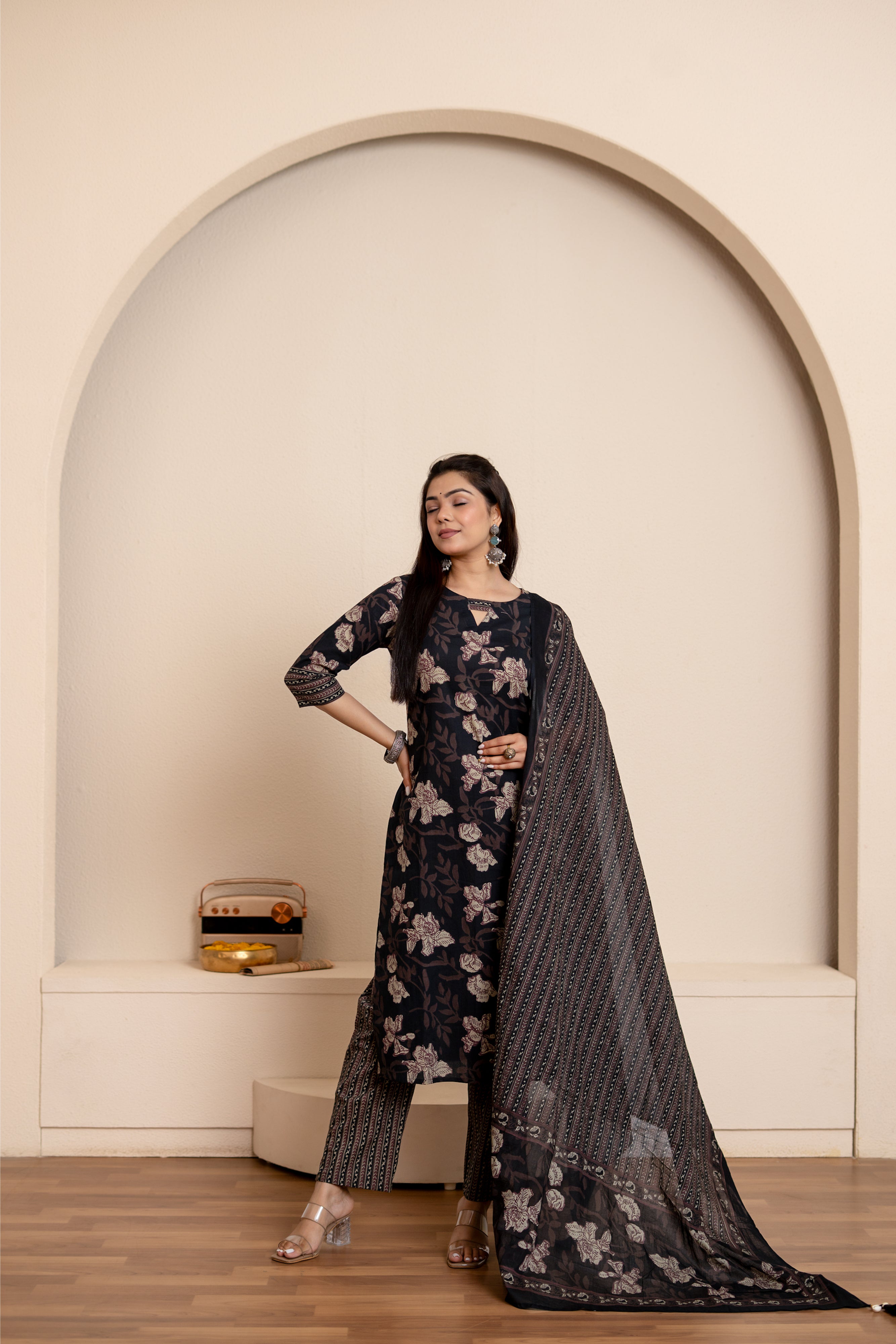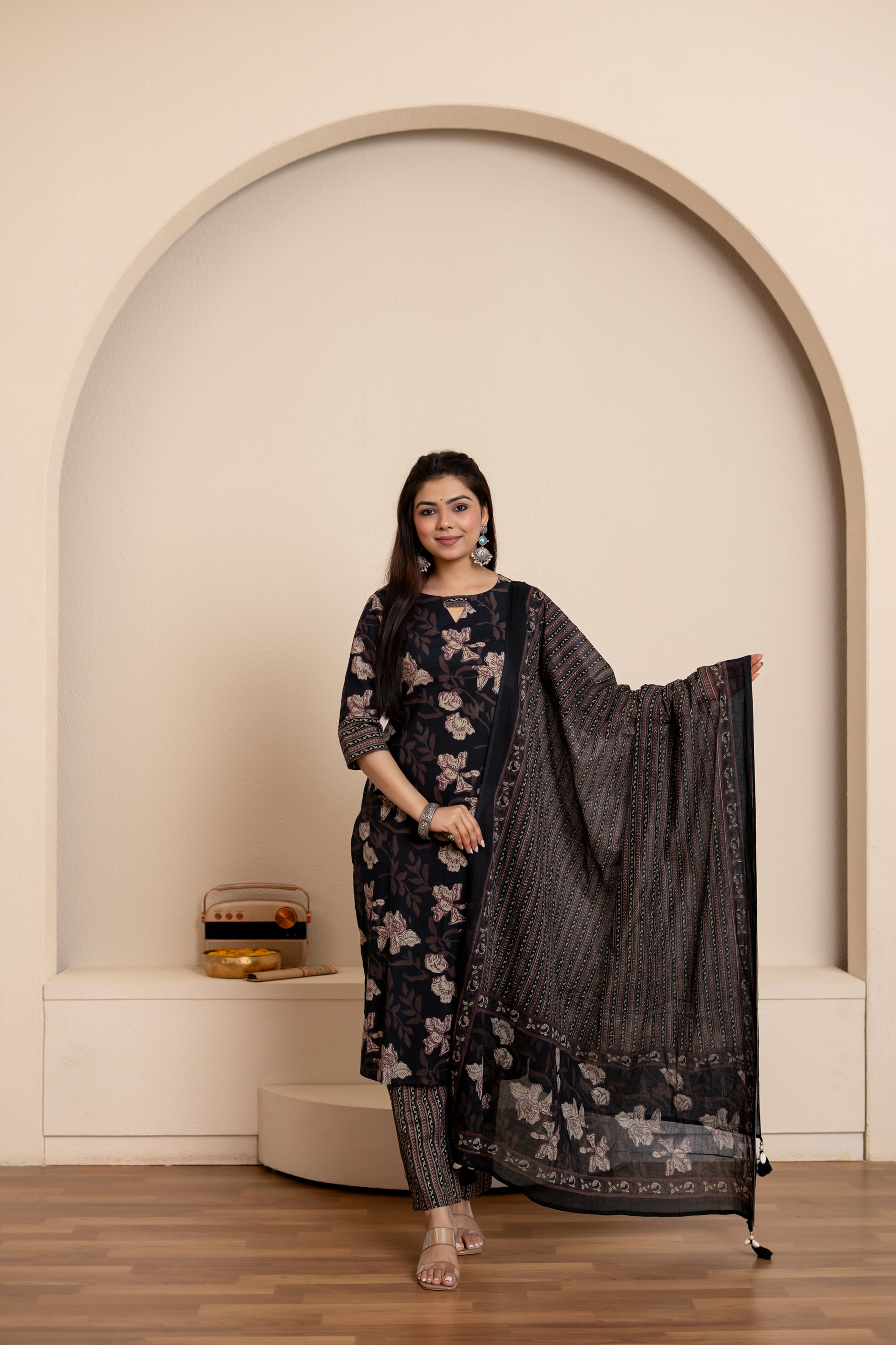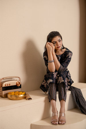 — Black floral handblock printed suit set with smart sleeves and neckline, matching trousers with pockets and matching dupatta with tassels.