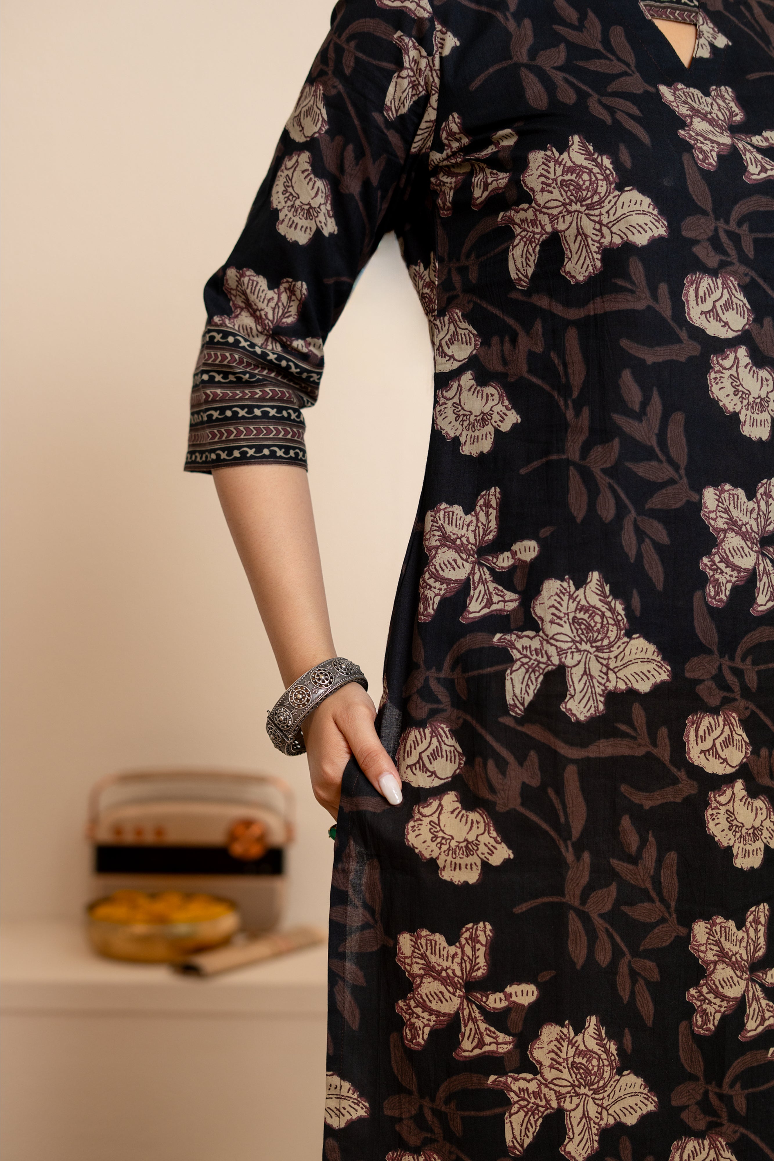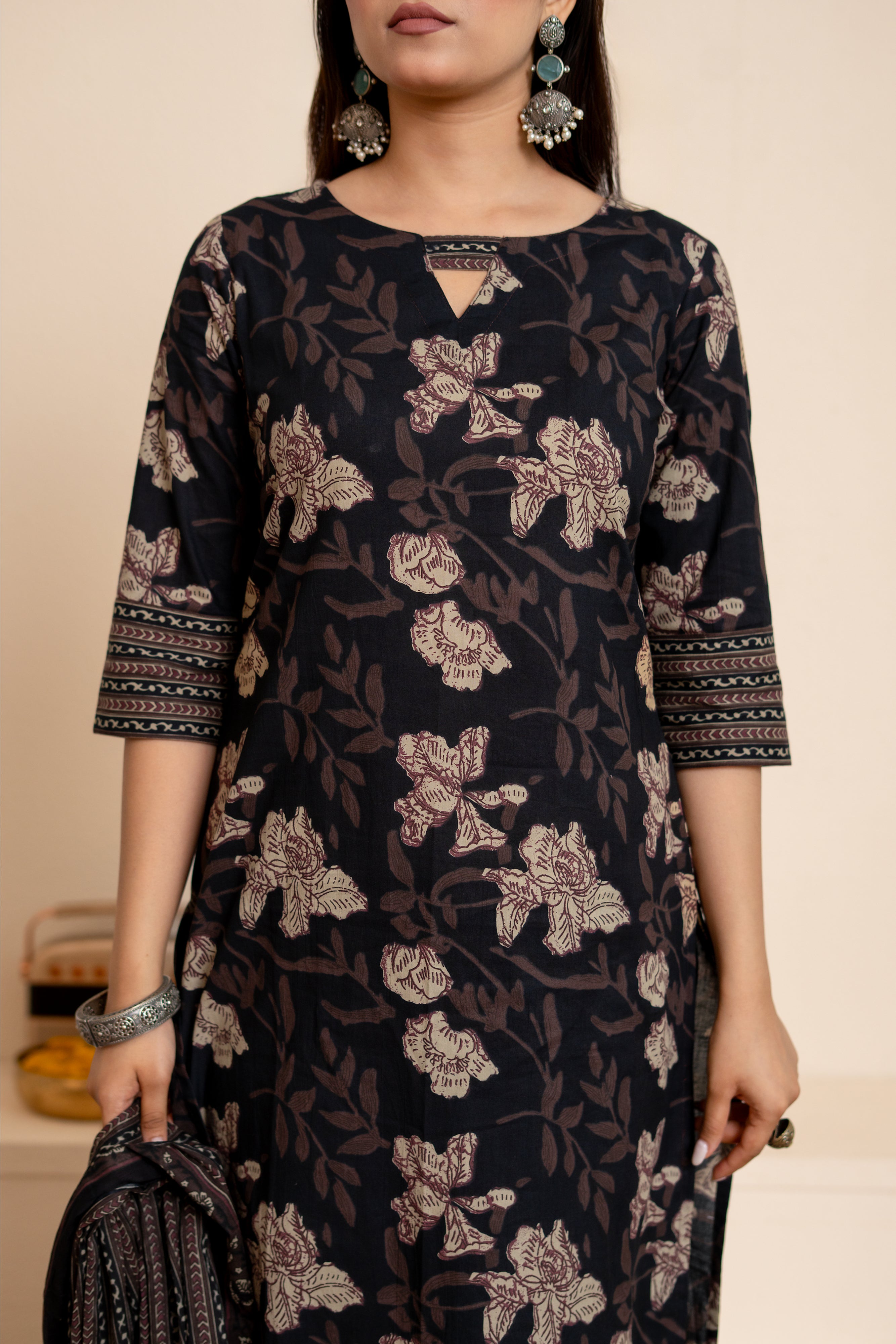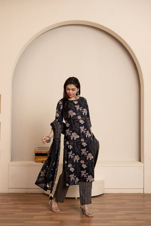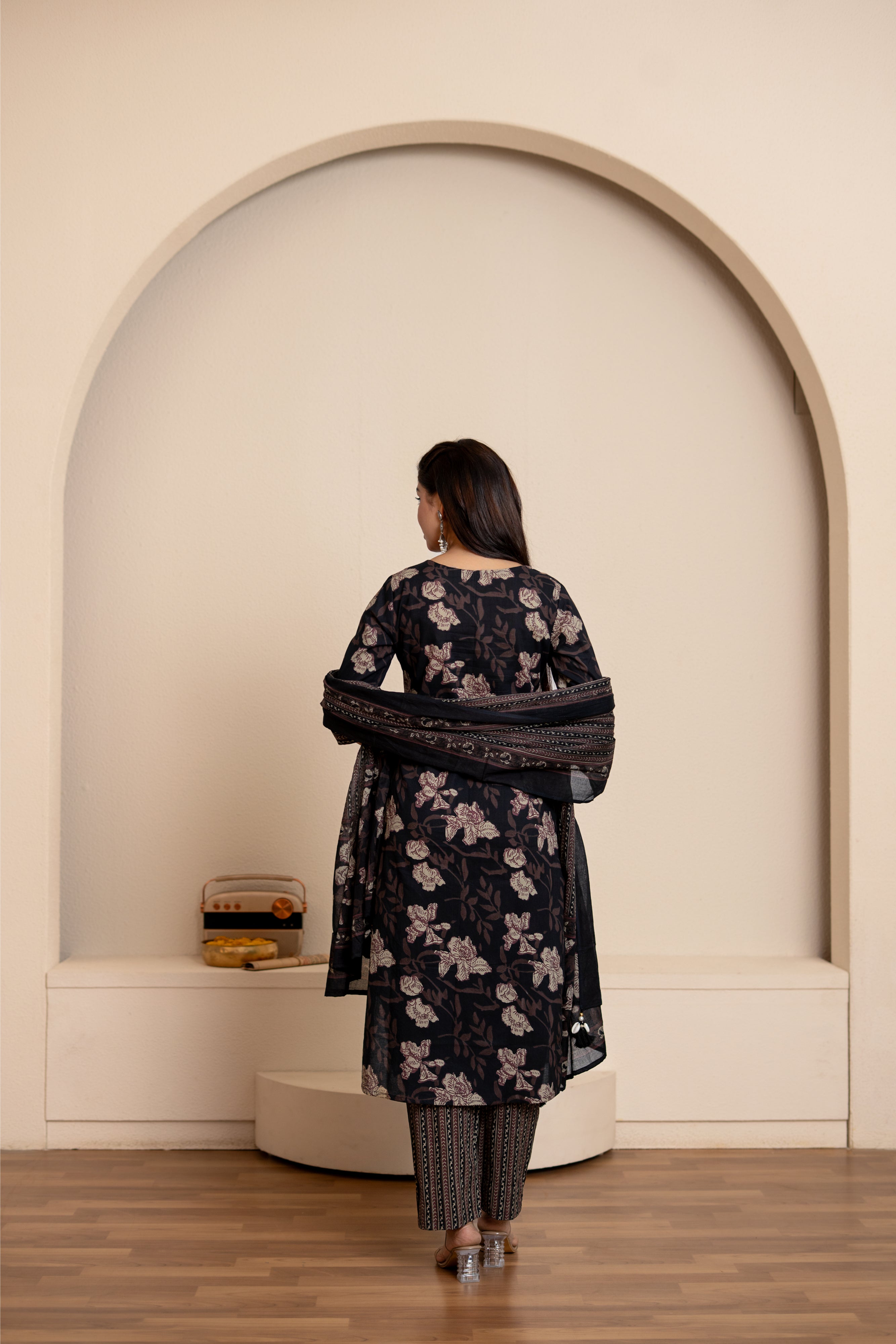 — Black floral handblock printed suit set with smart sleeves and neckline, matching trousers with pockets and matching dupatta with tassels.