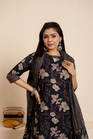 Vismaya - floral silhouette hand block printed suit set in black colour