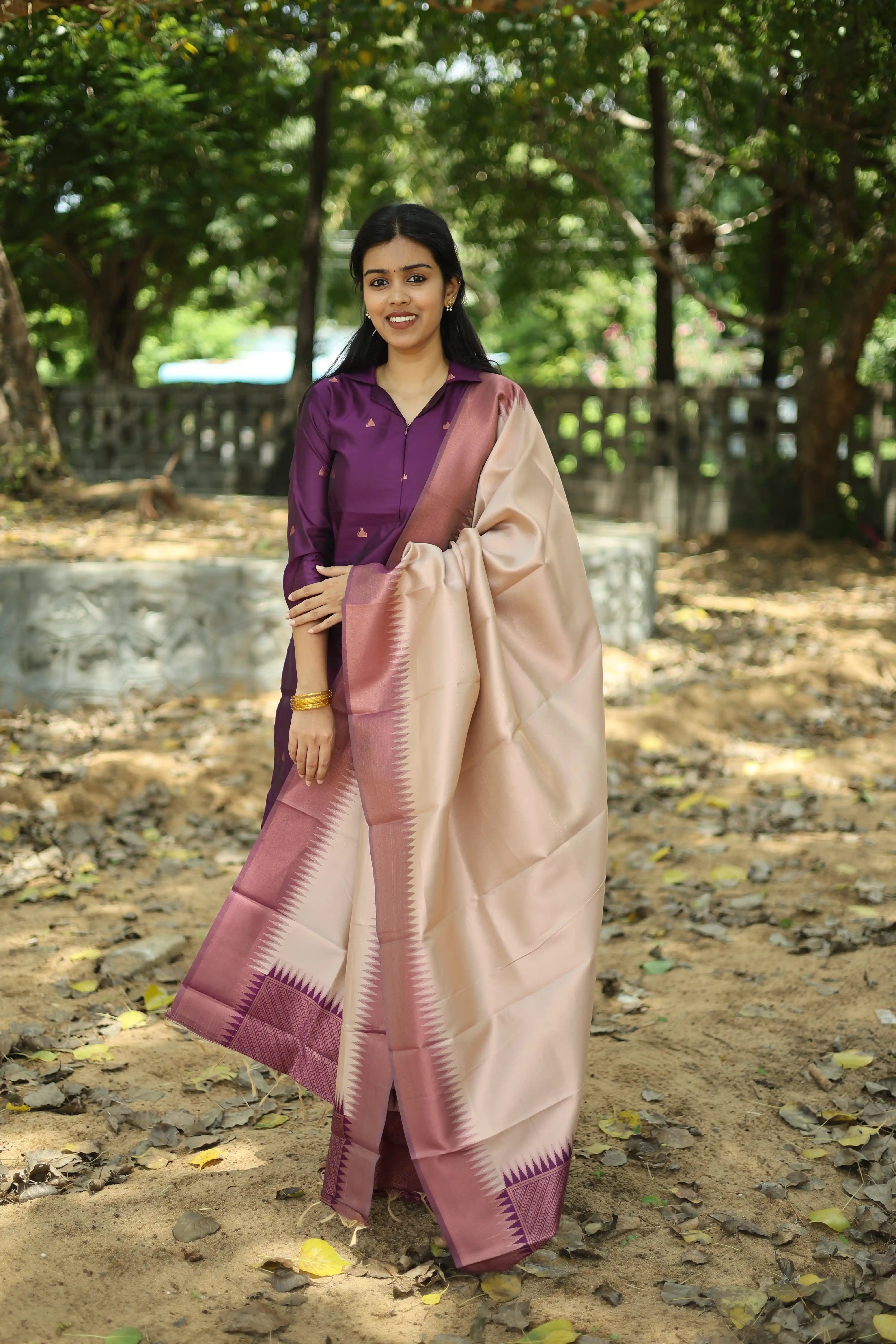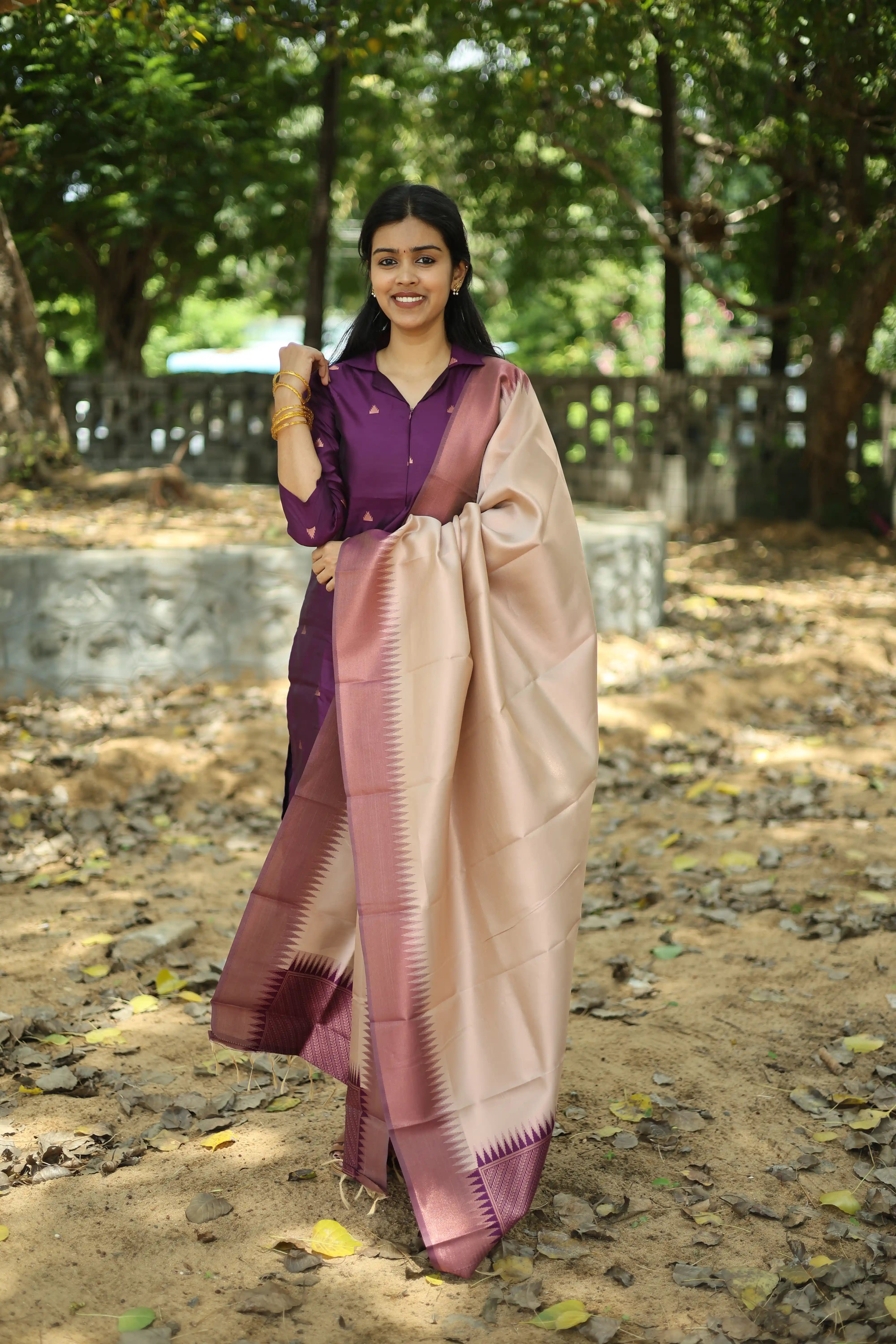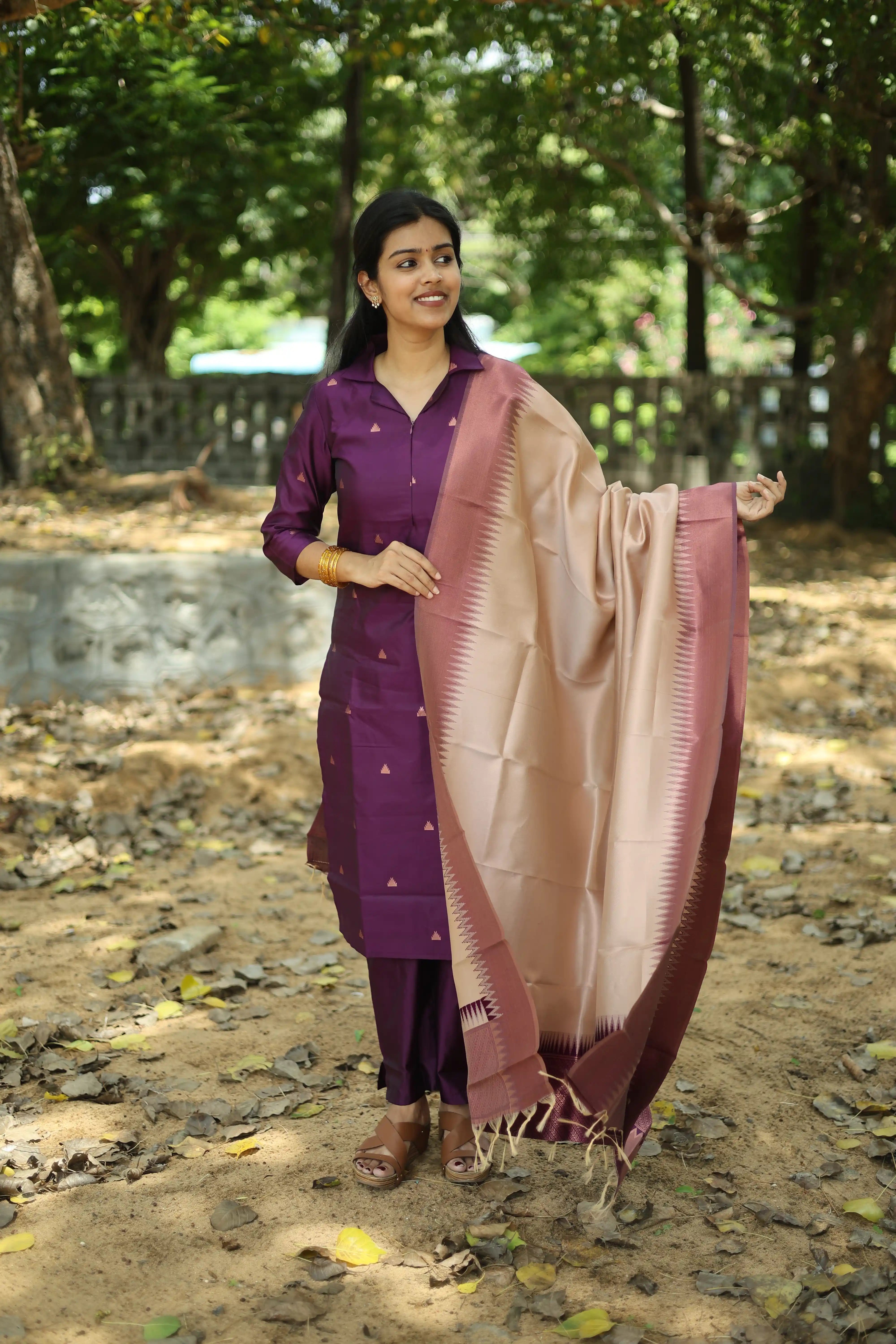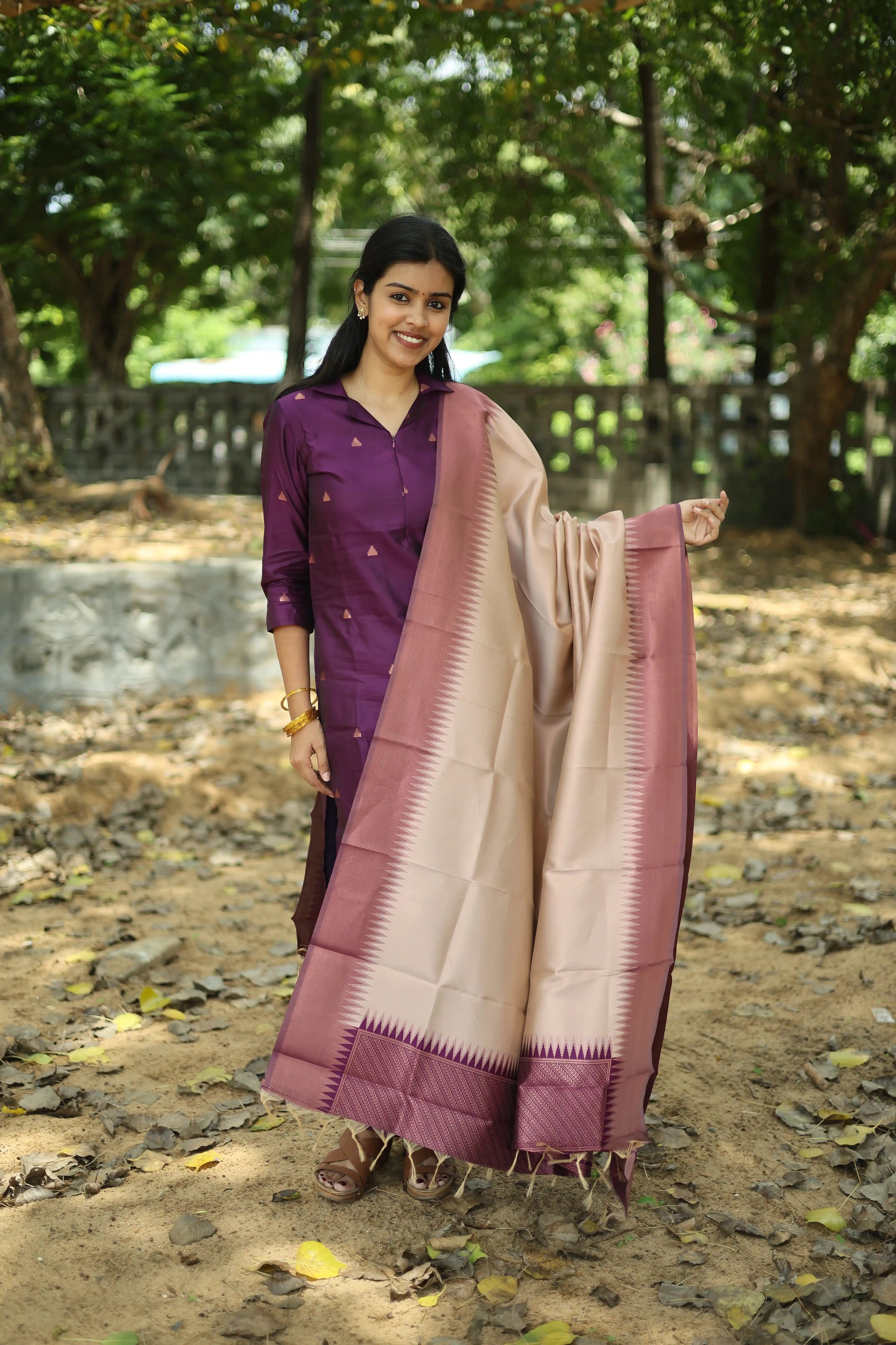 Complimenting beige tissue silk dupatta with purple temple borders.