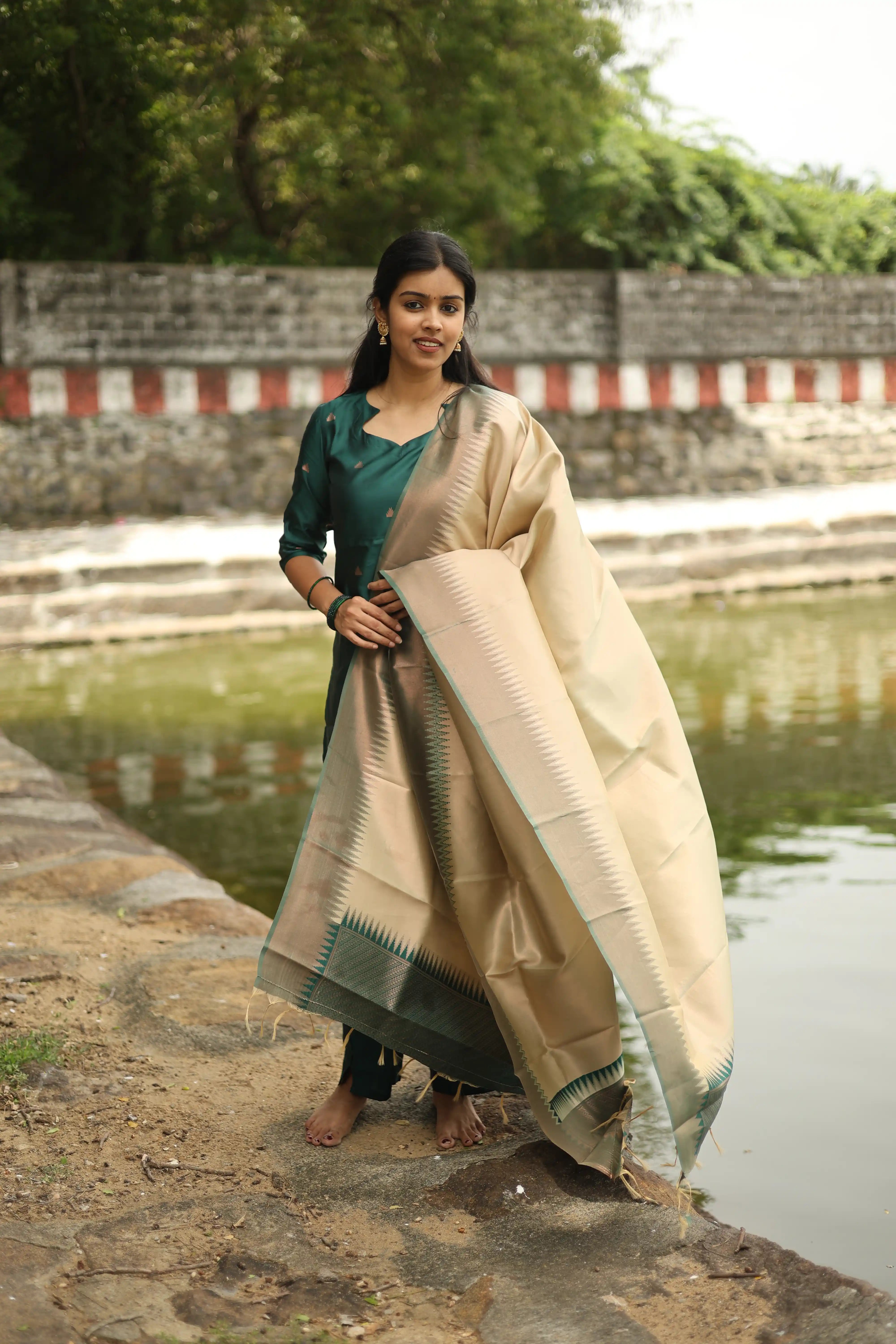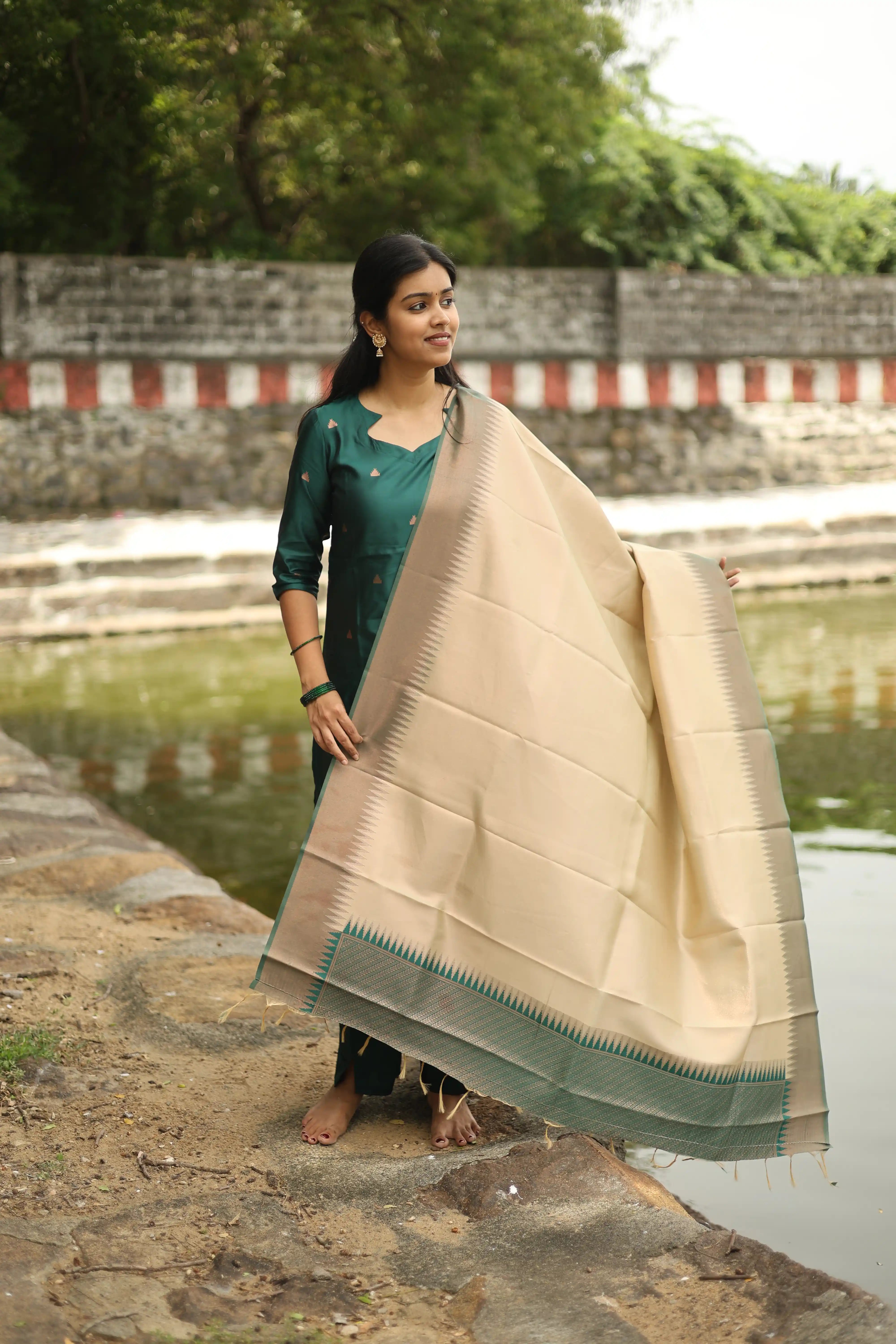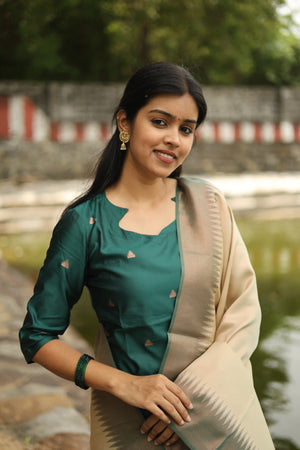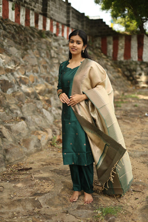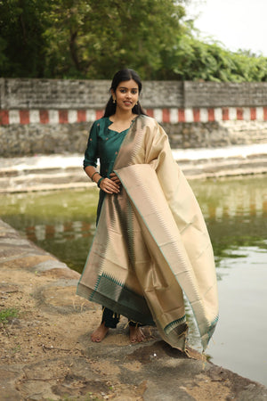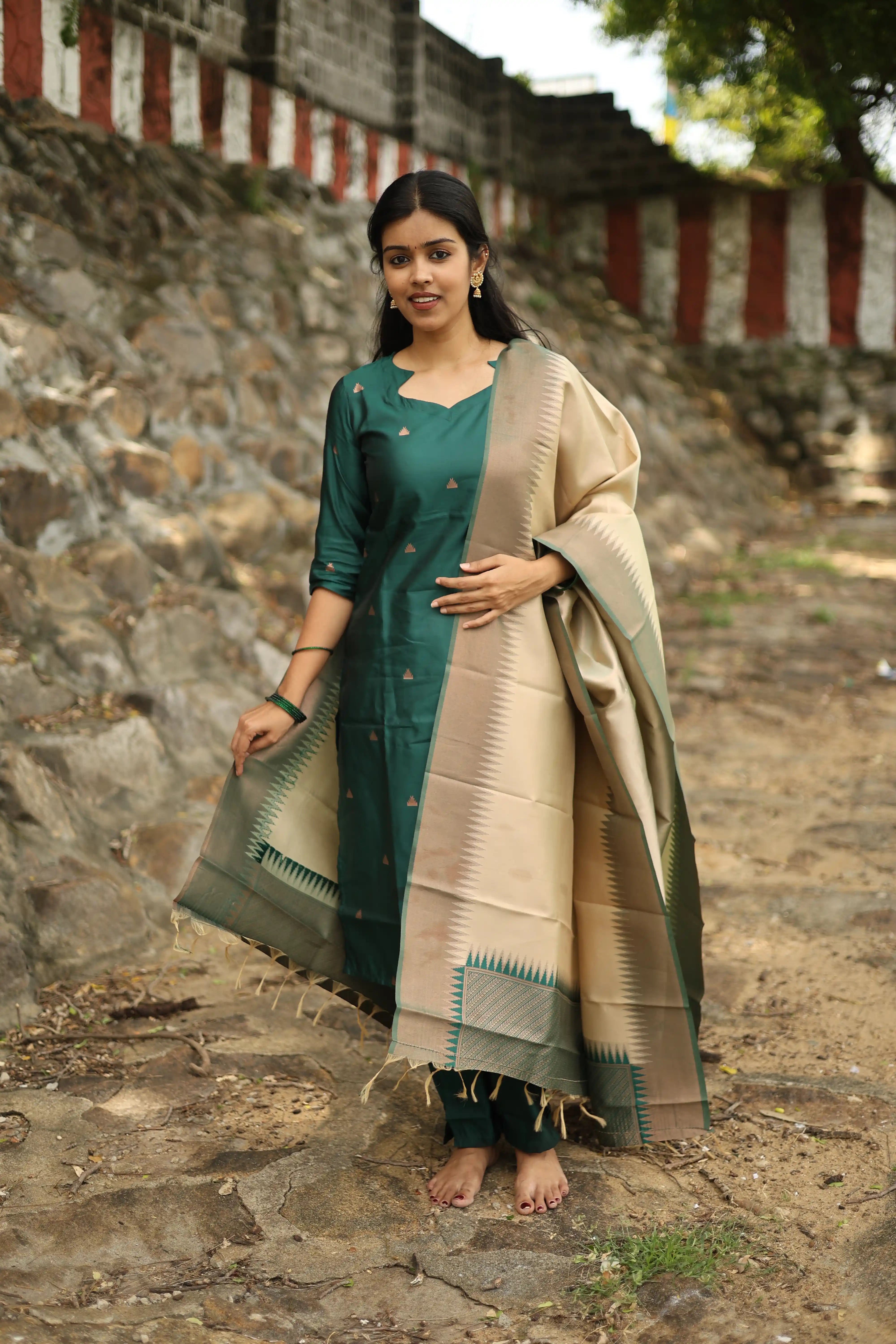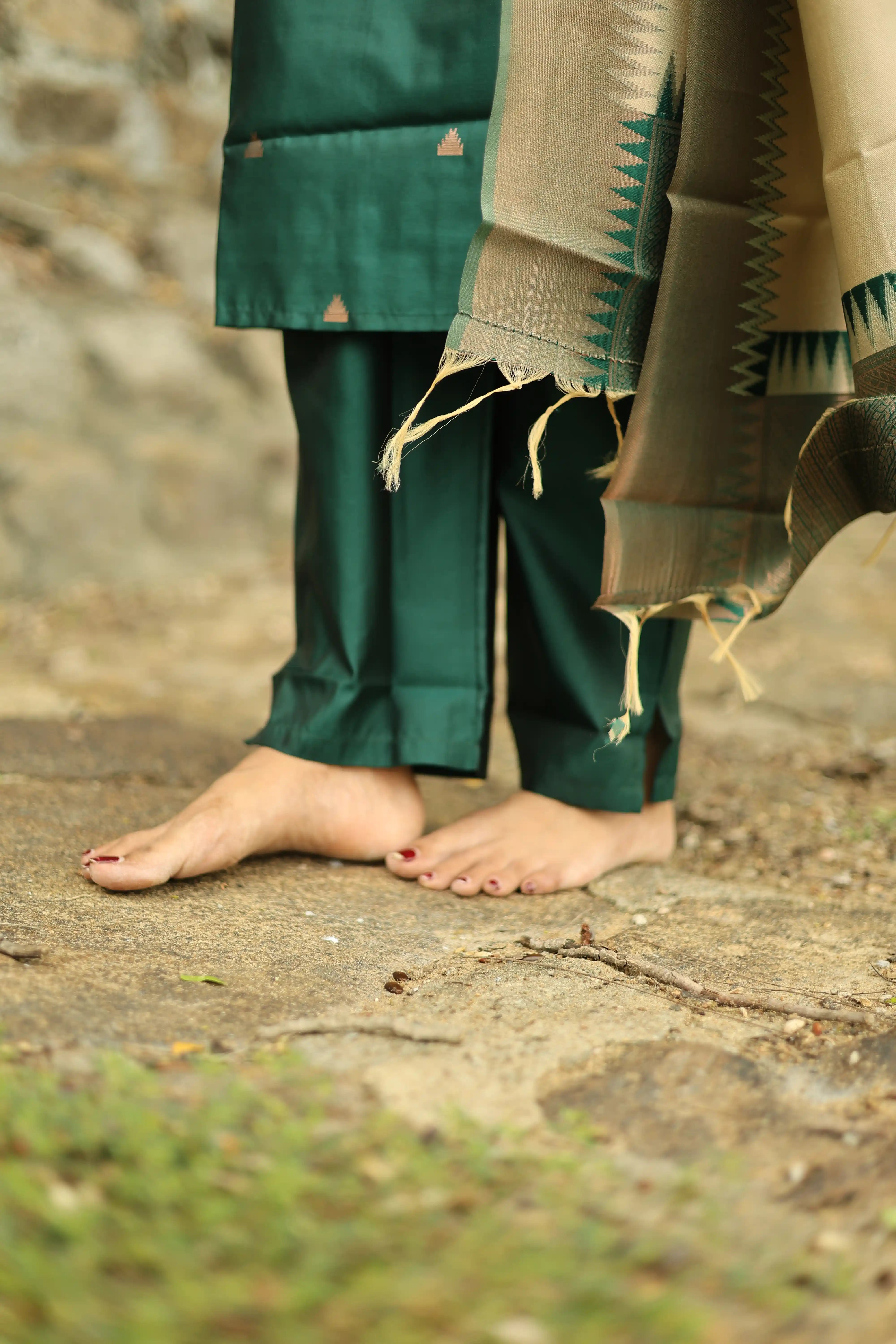 Vruksha Emerald Grace - green vegan silk suit set with beige dupatta with temple border