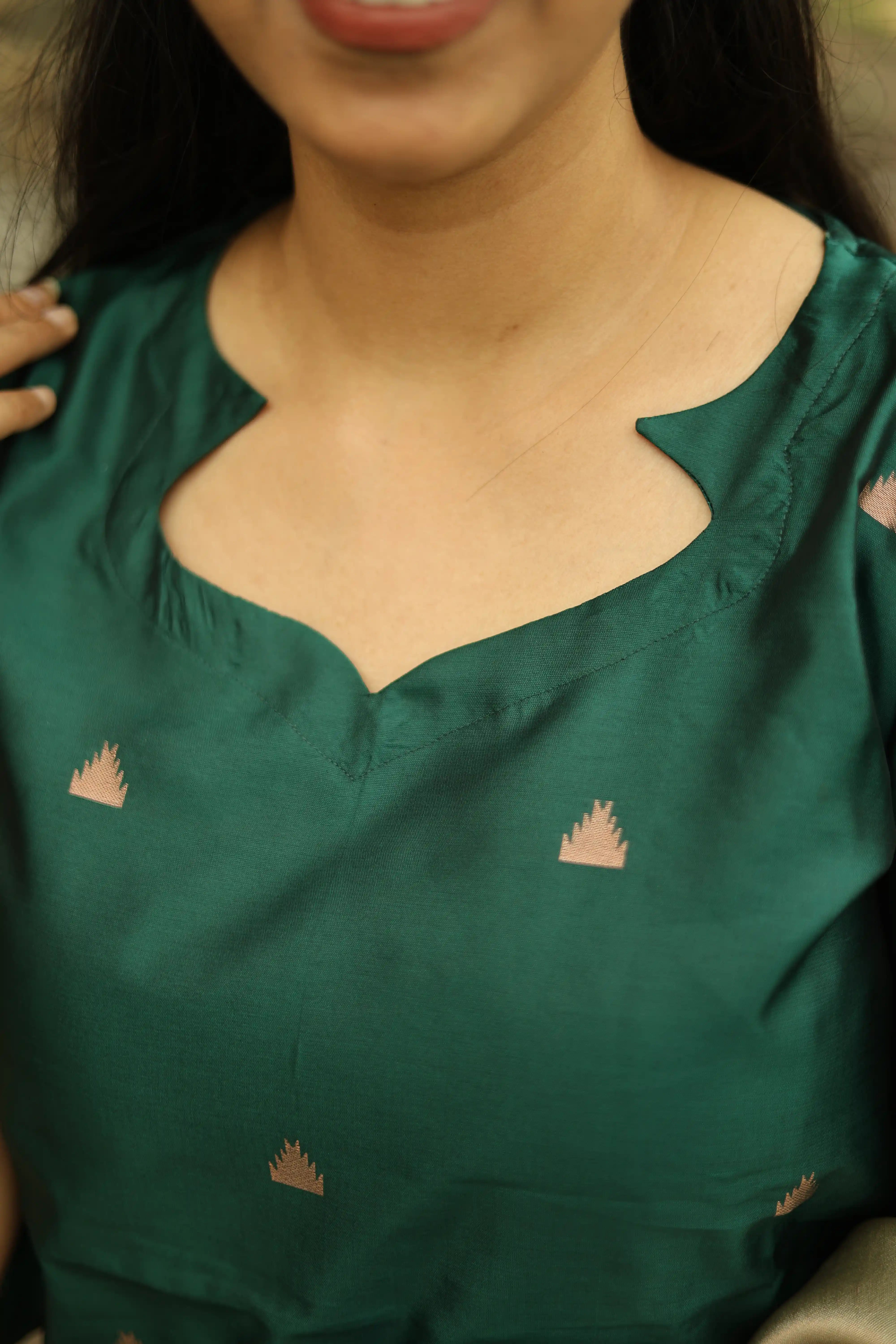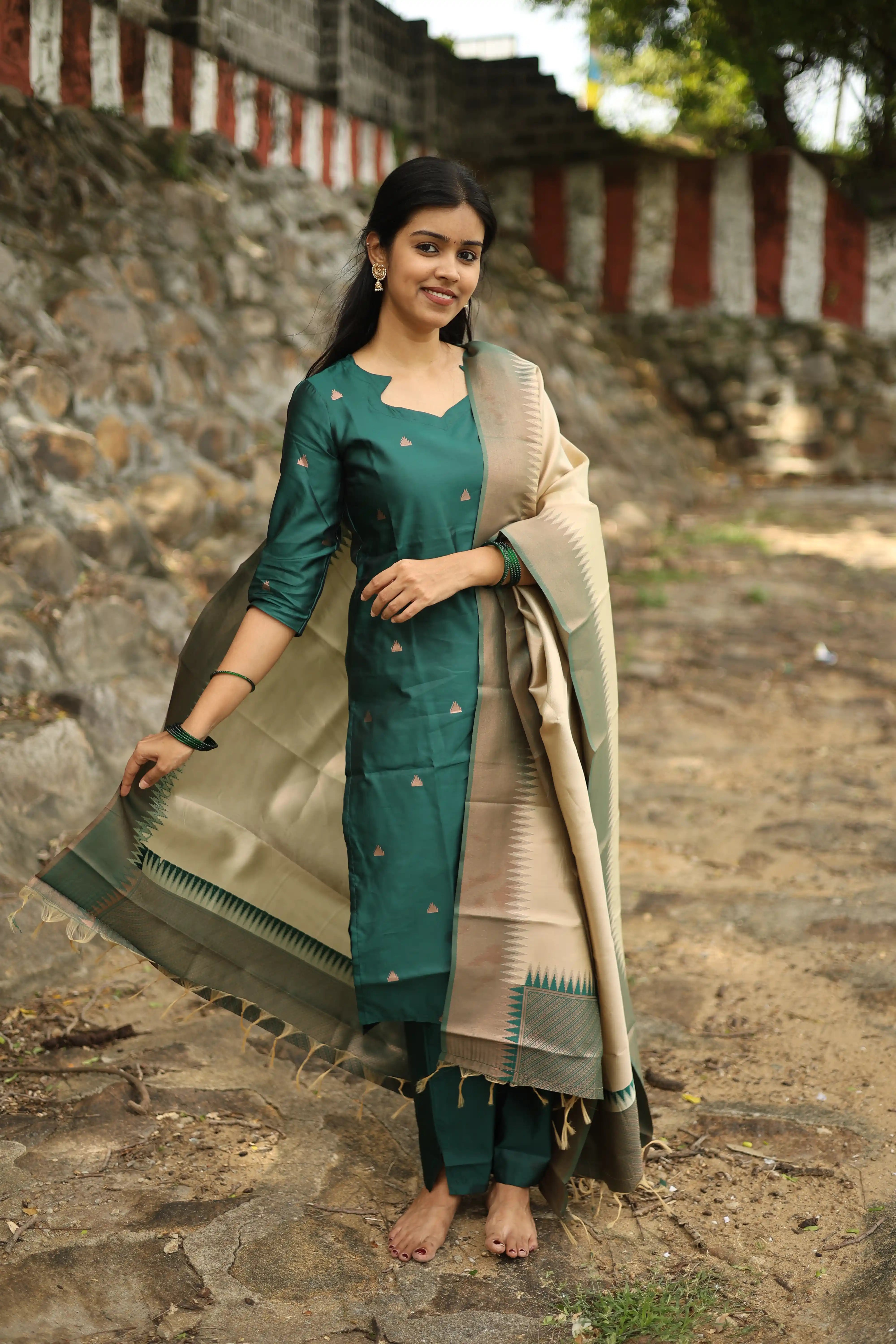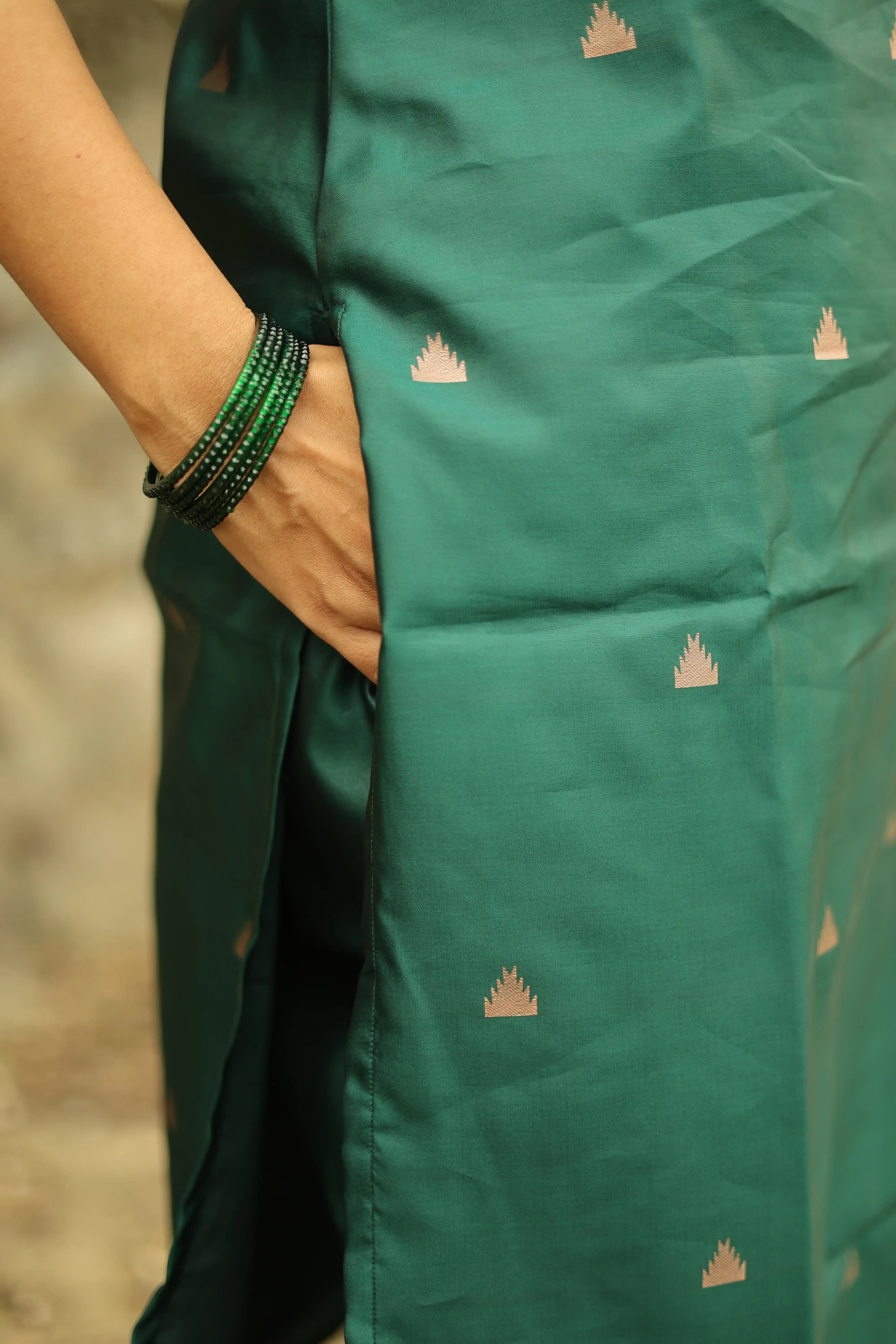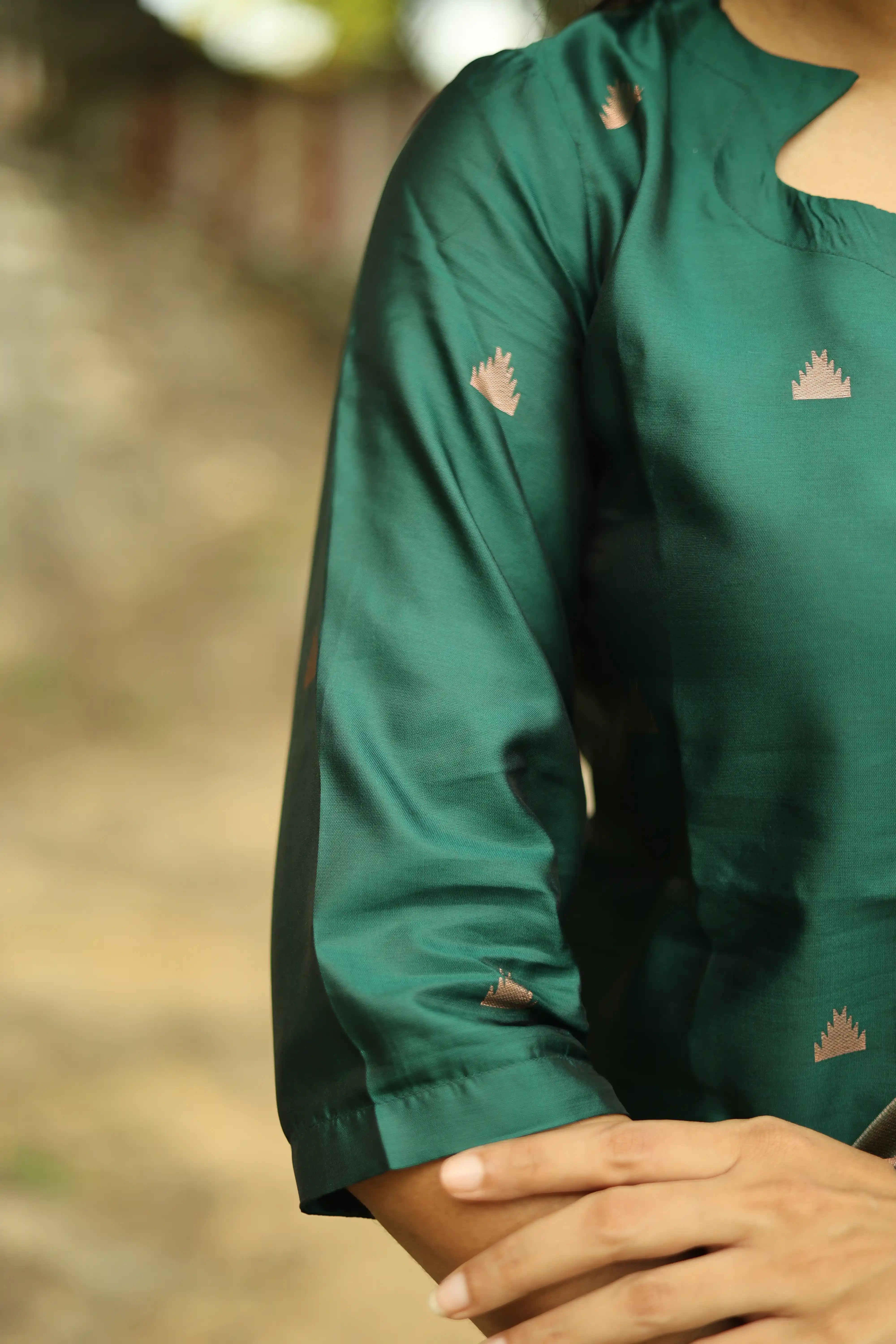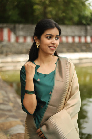 Vruksha Emerald Grace - green vegan silk suit set with beige dupatta with temple border
