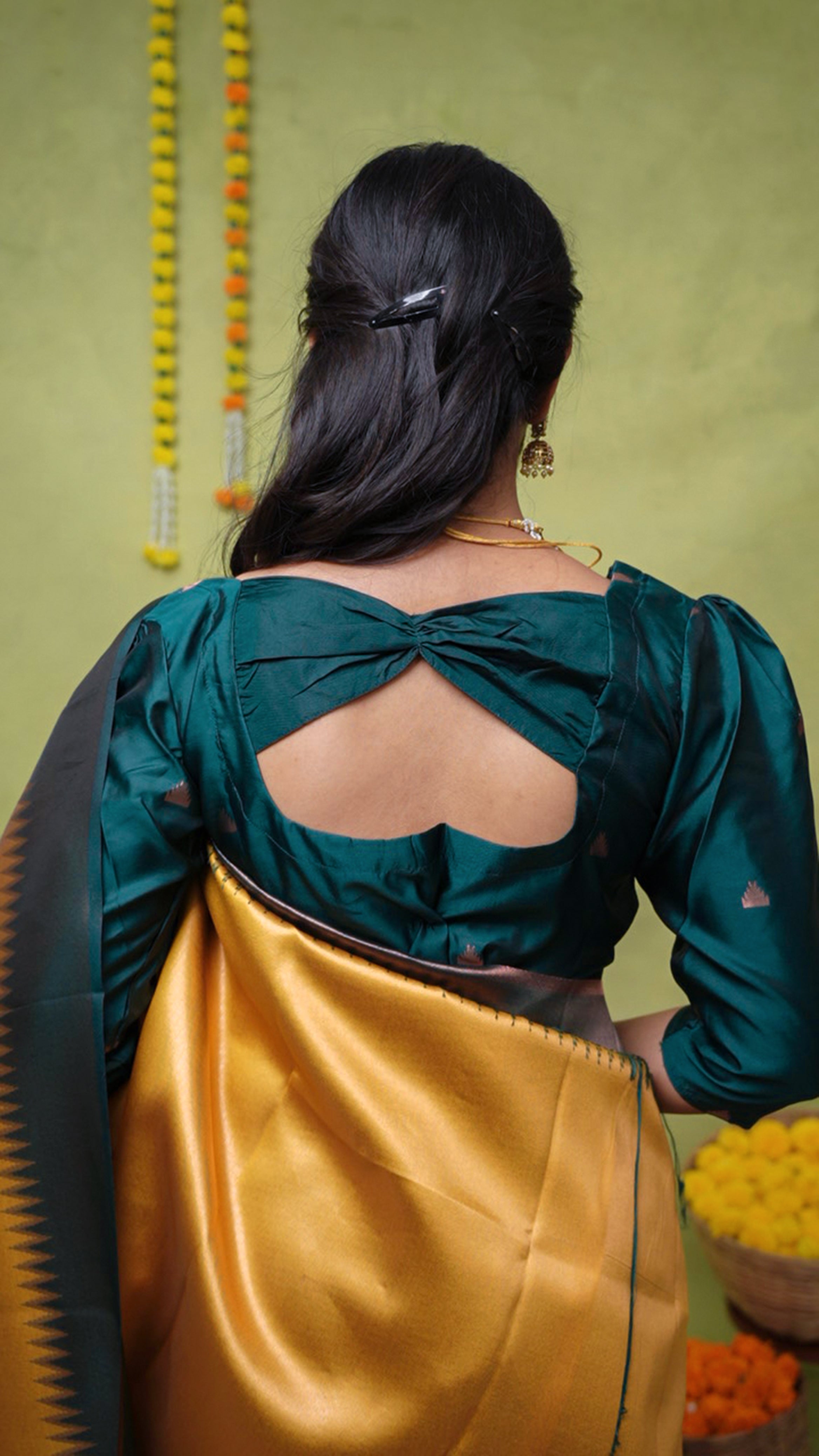 Complimenting yellow tissue silk dupatta with green temple borders.