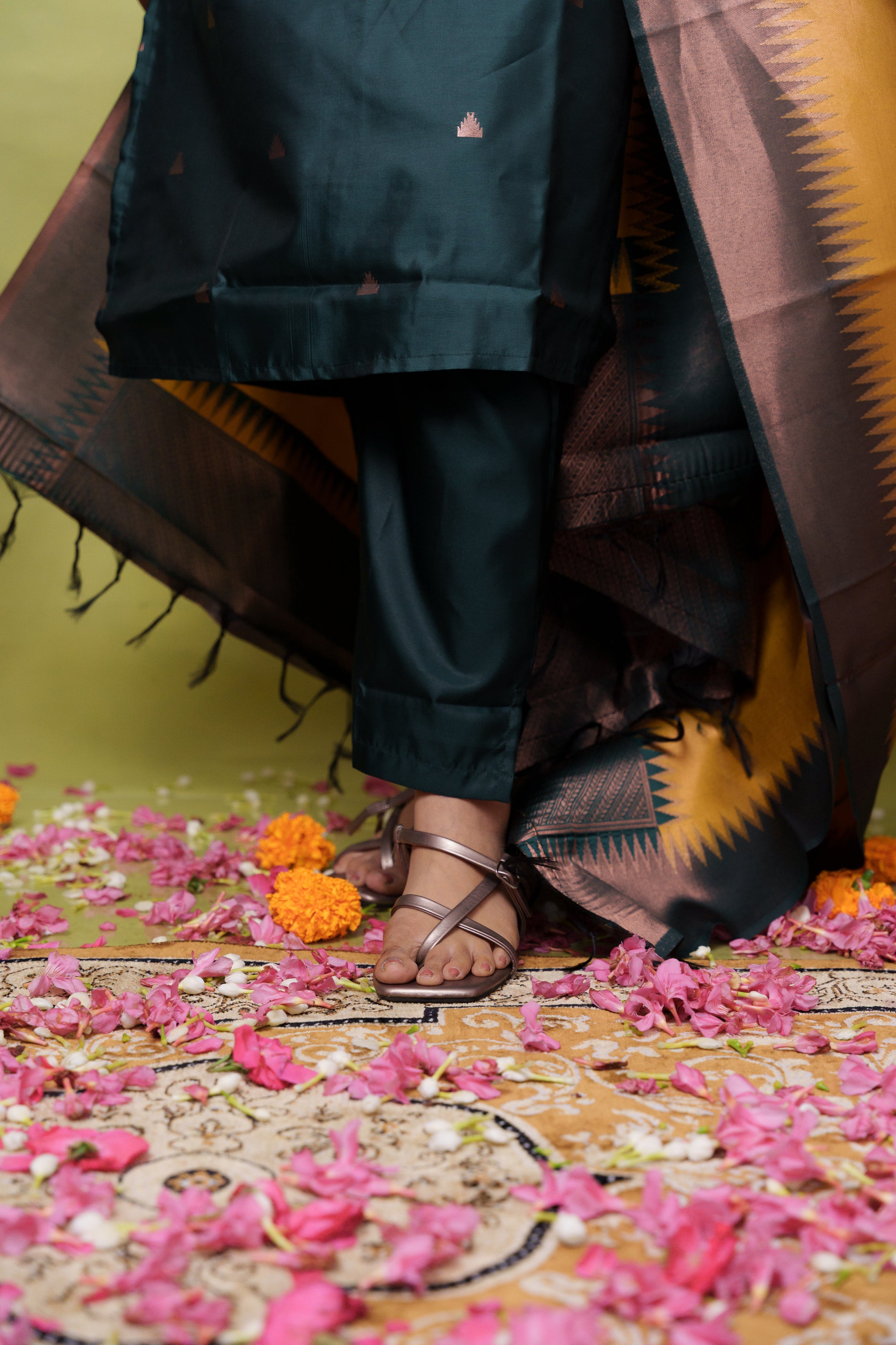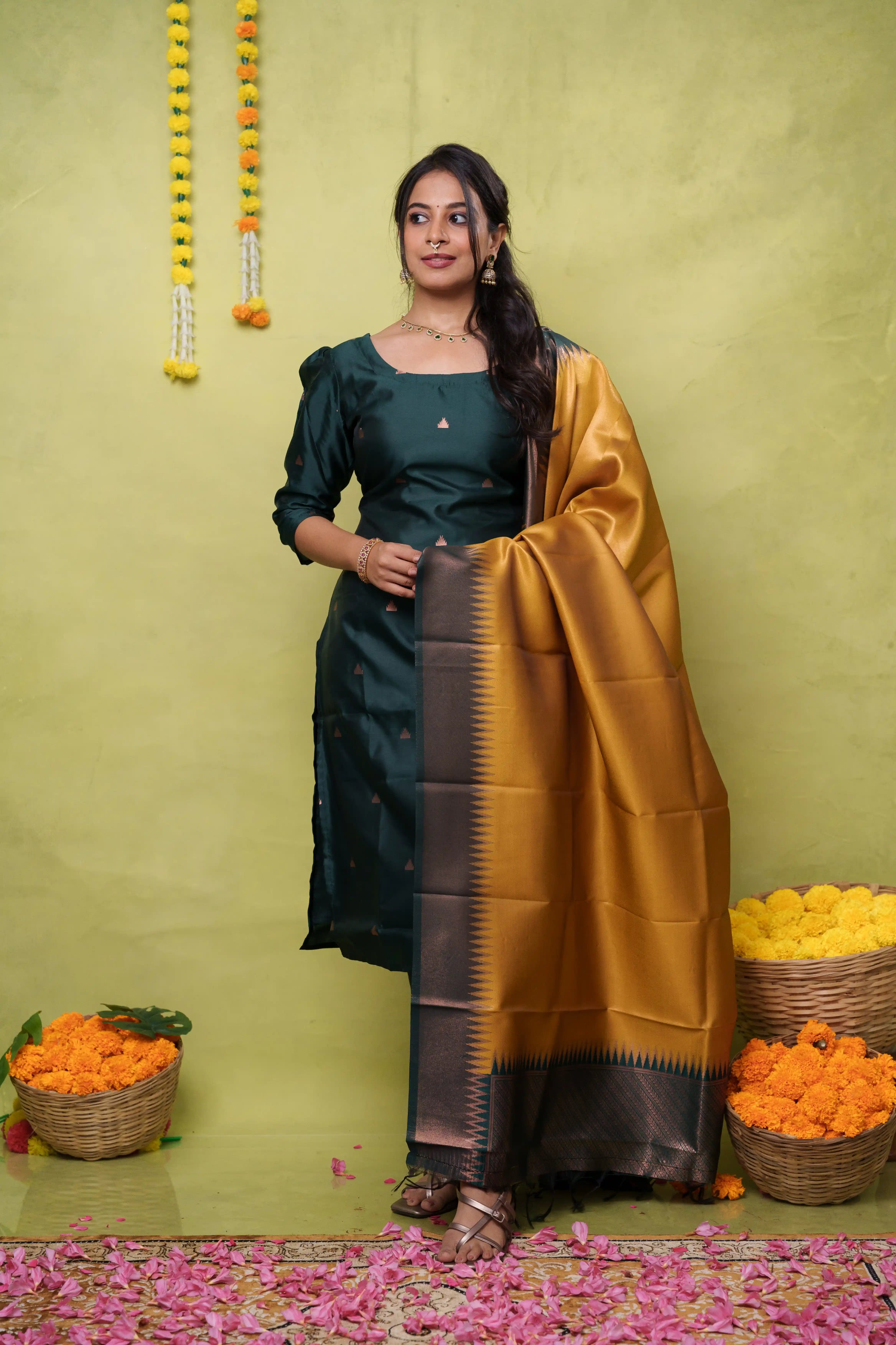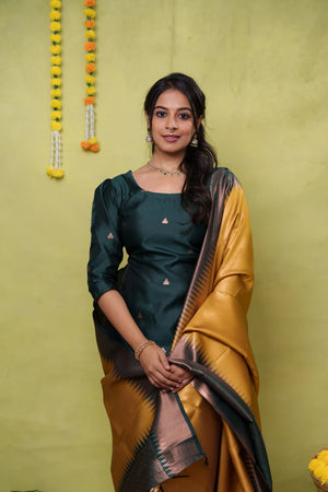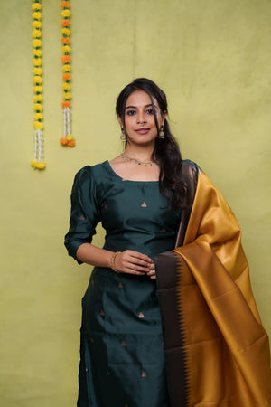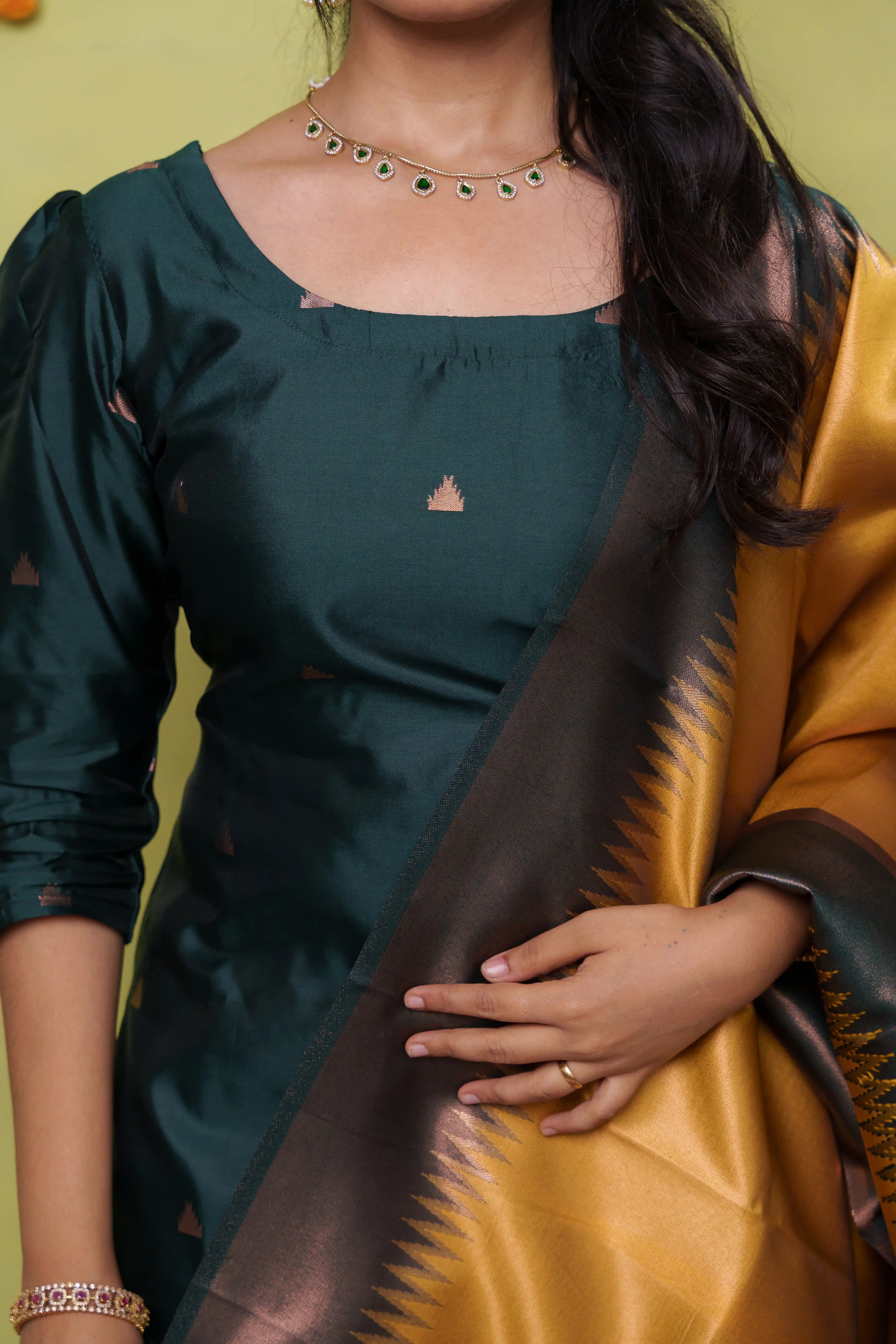 Vruksha Sunlit Emerald - green vegan silk suit with yellow dupatta with temple border