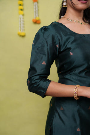 Pure vegan silk suit set in a beautiful shade of green colour. Smart neckline, sleeves and a cute back neck with a bow pattern and trousers with pockets too.