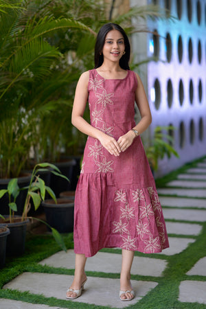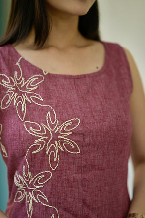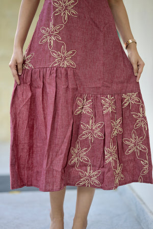 Women linen dress 2 - wine colour linen cotton dress with embroidery