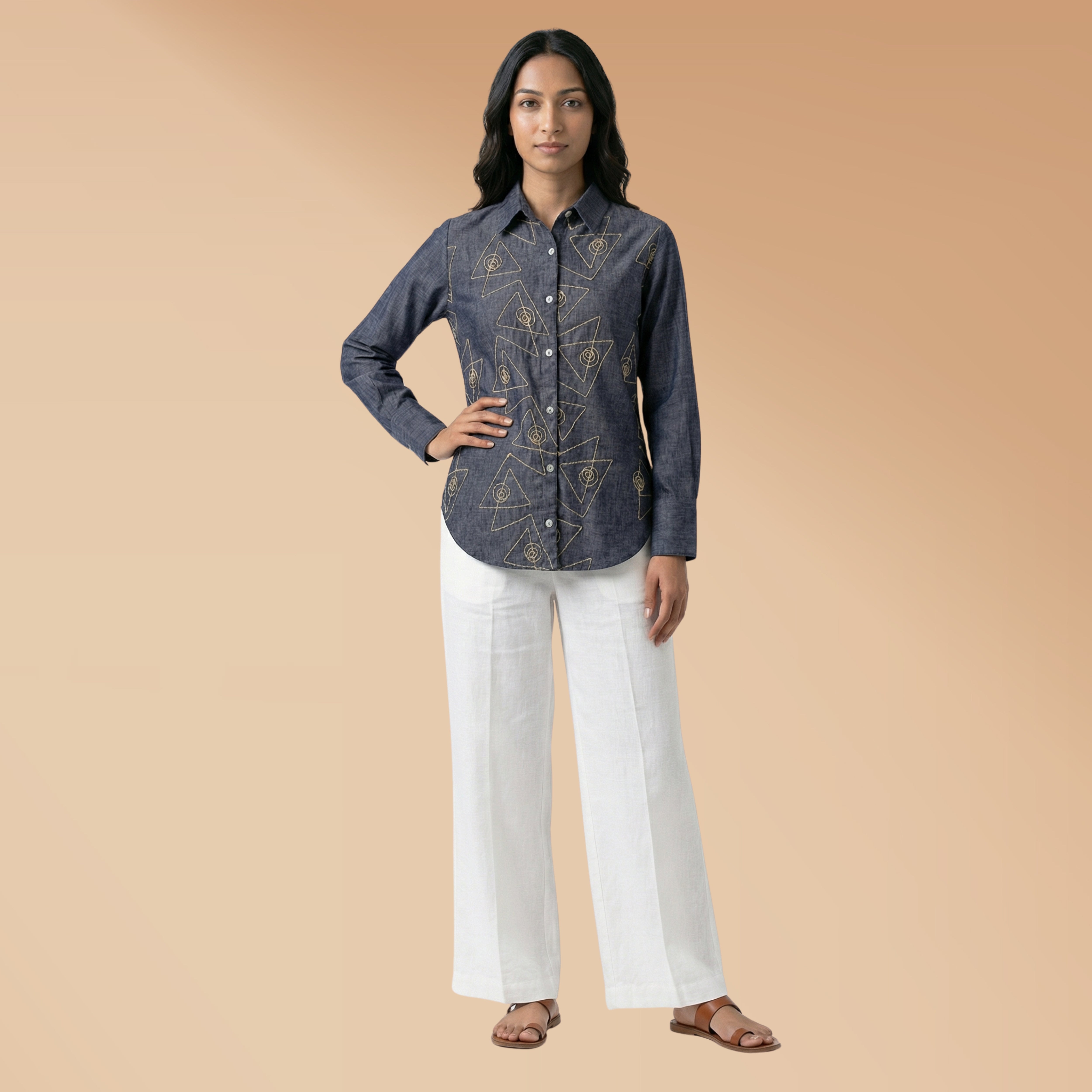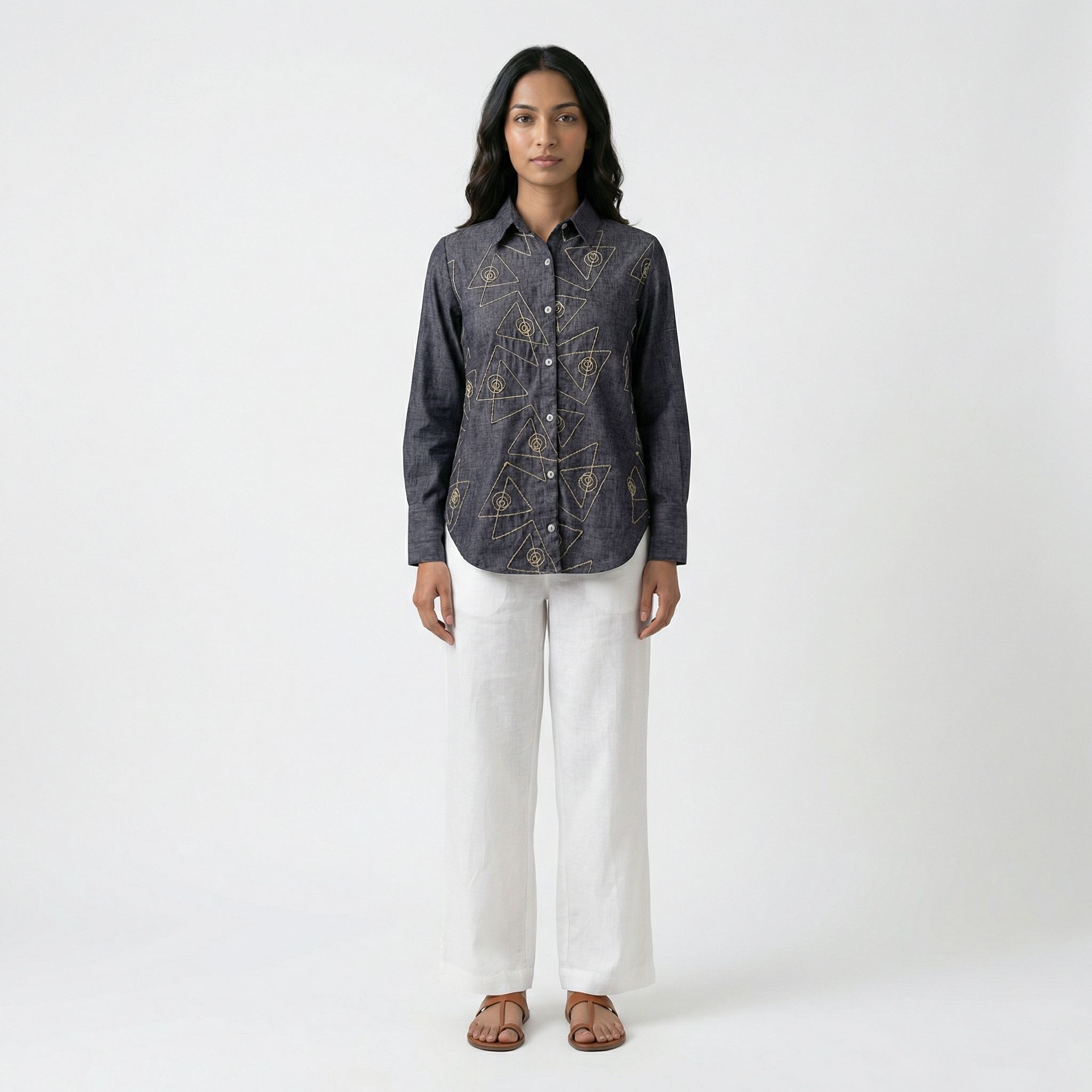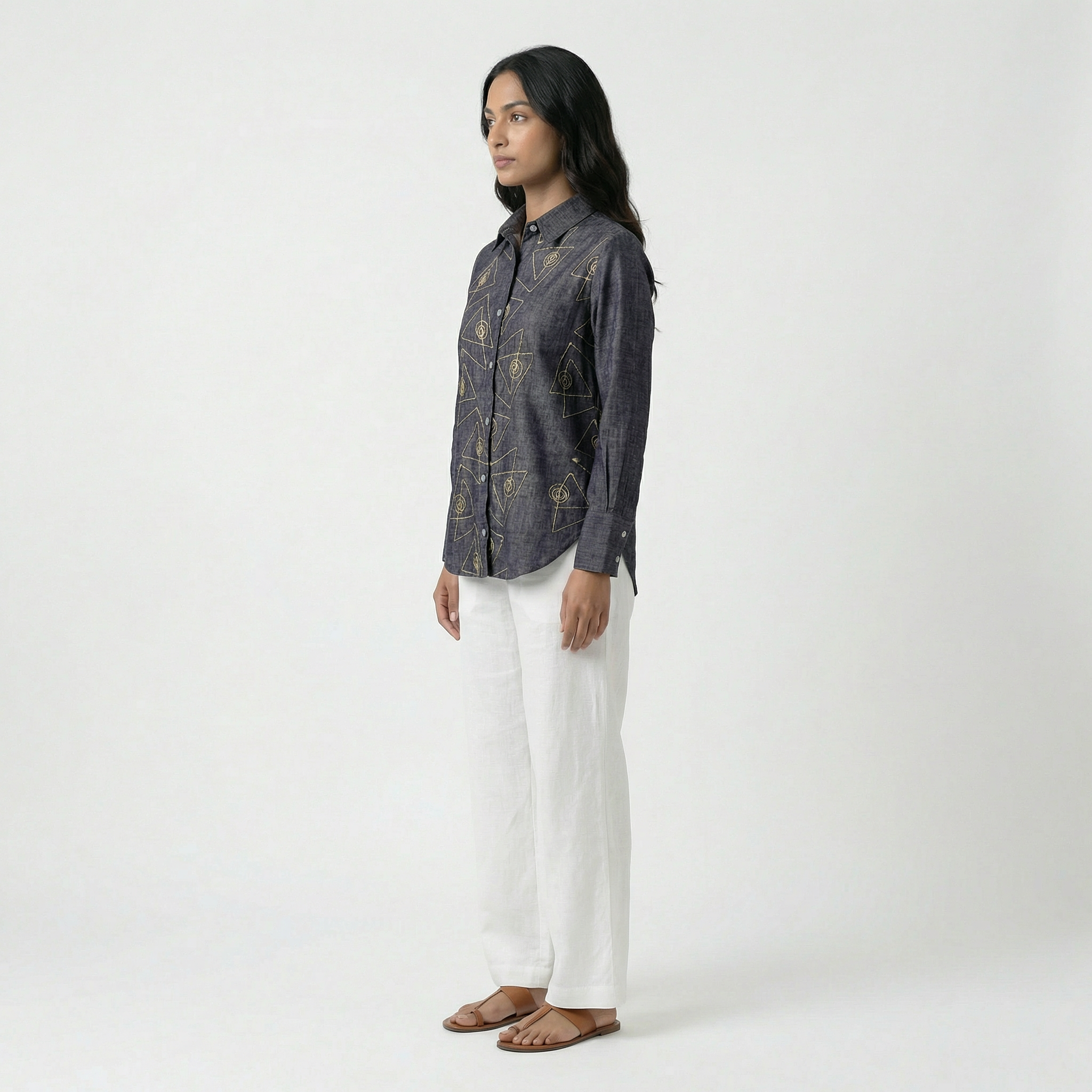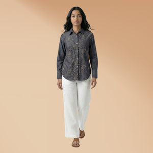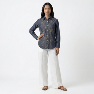 Pure handloom linen cotton shirt in denim blue colour with white hand embroidery all over the shirt. Super soft and comfortable and absolutely chic.