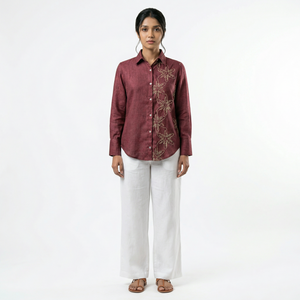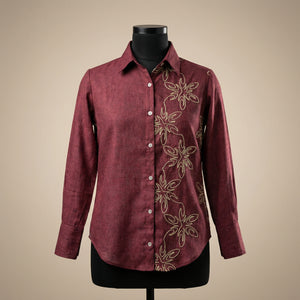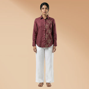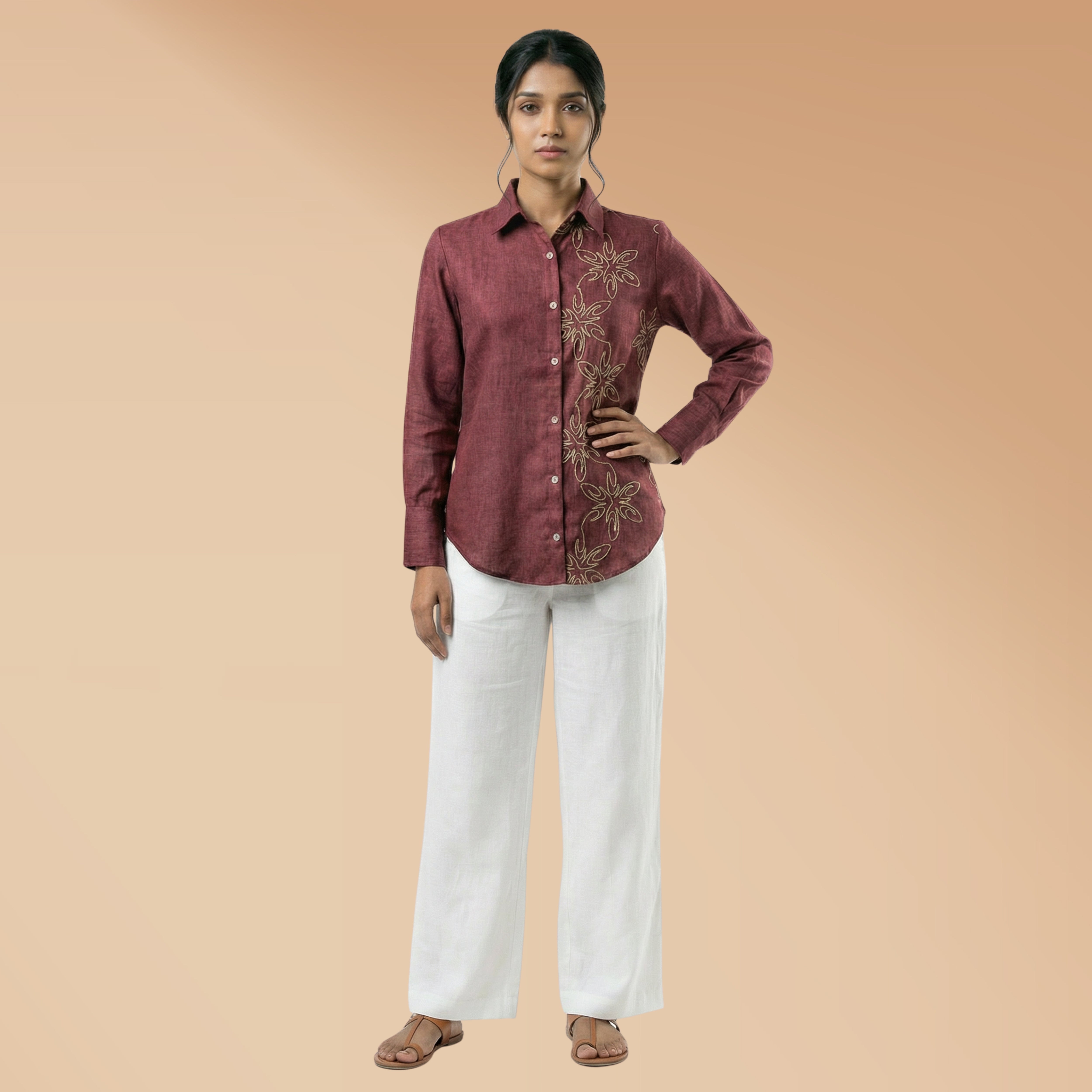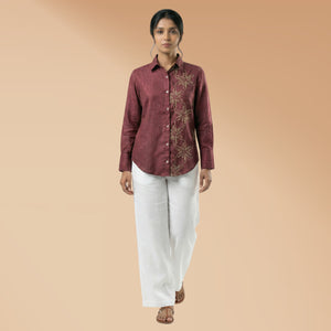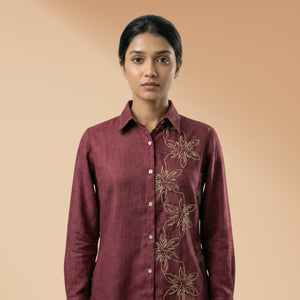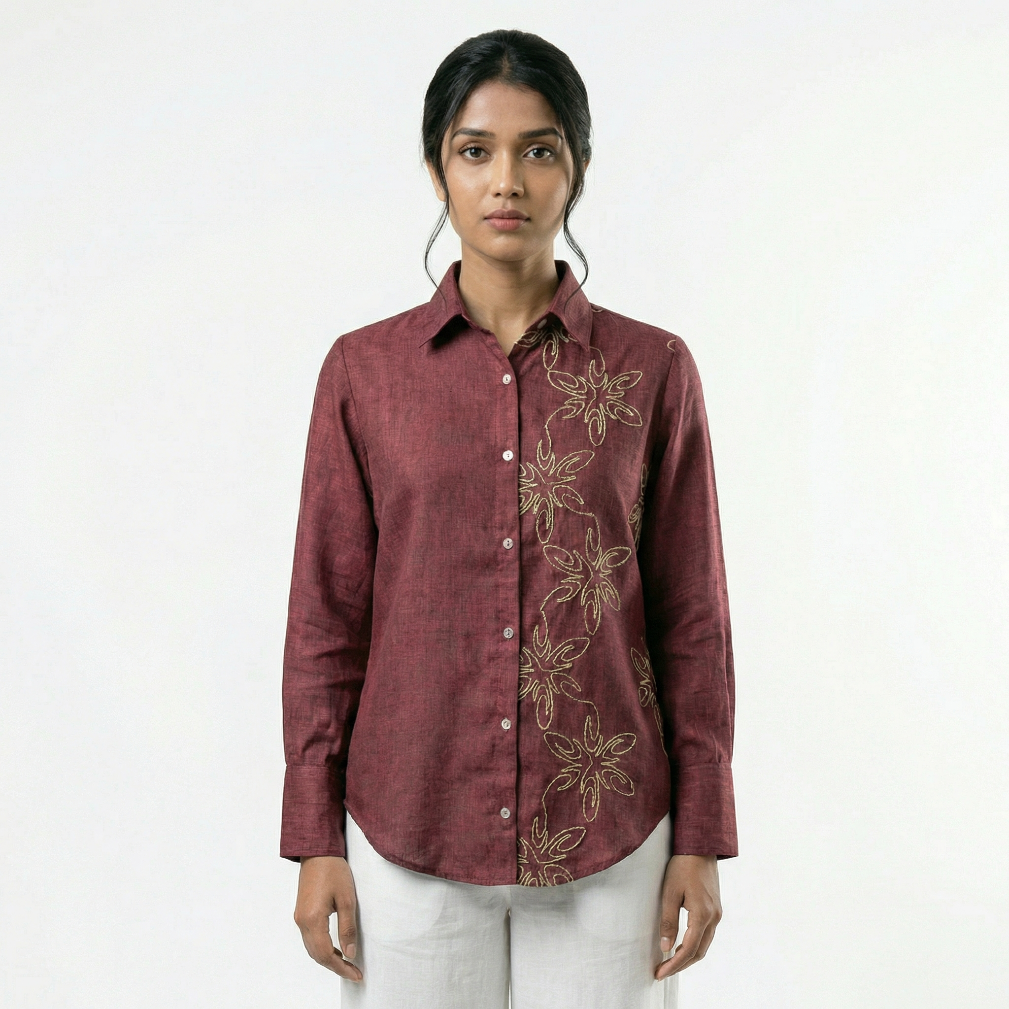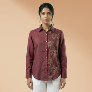 Women Linen shirt 3 - linen cotton shirt marooncolour with hand embroidery