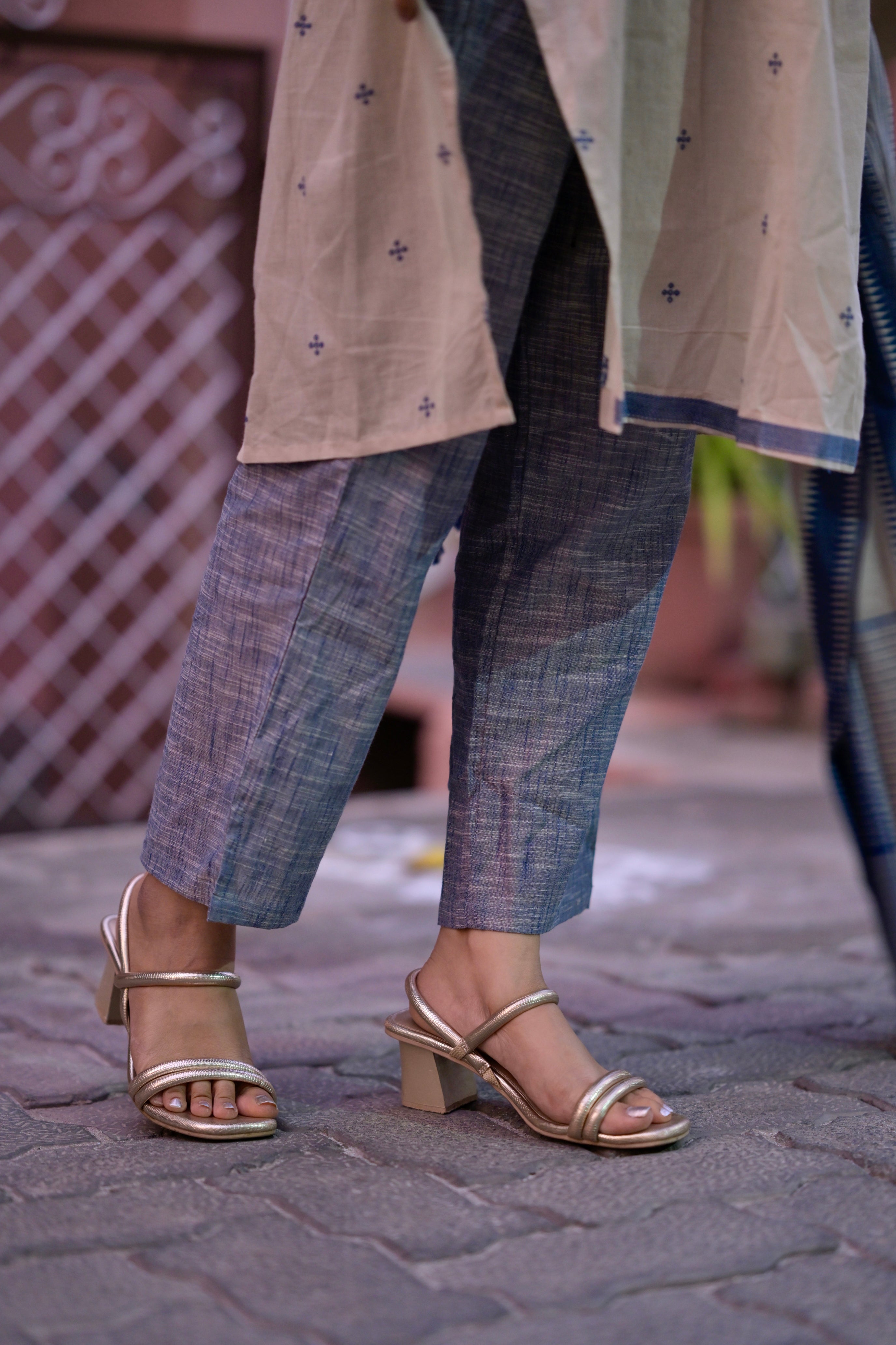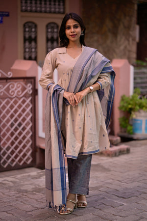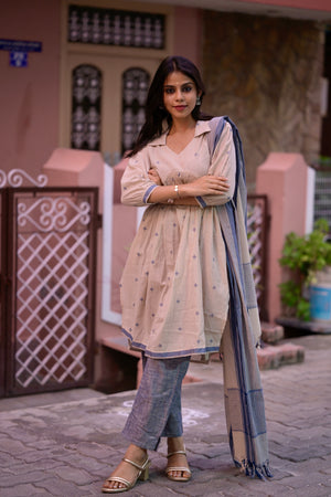 — Handloom linen cotton kurta set in cream and blue with smart neck detailing, sleeve detailing and comes with handloom linen cotton trousers with functional pockets and matching dupatta.