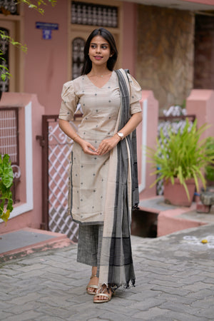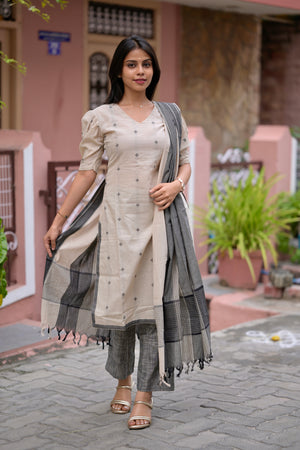 鈥� Handloom linen cotton kurta set in cream and grey with smart neck detailing, sleeve detailing and comes with handloom linen cotton trousers with functional pockets and matching dupatta.