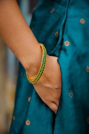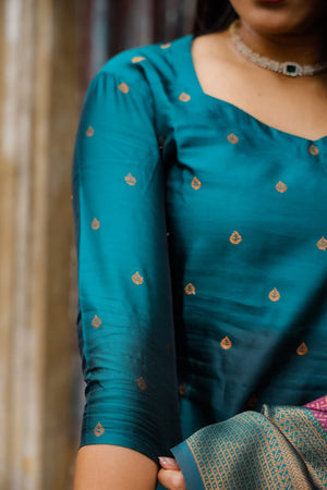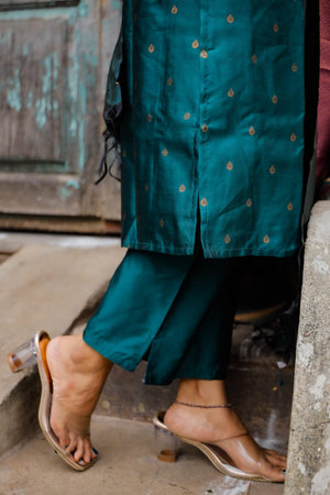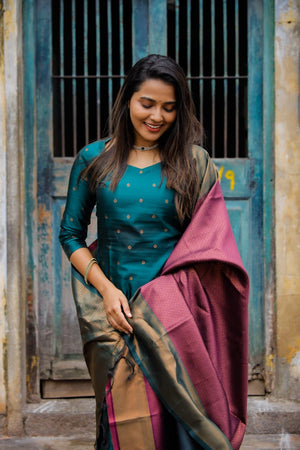 Green colour semi kanchipuram vegan silk kurta set which has lavander zari buttas all over. It has a smart sweet heart neck detailing and 3/4th sleeves with slits.聽