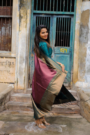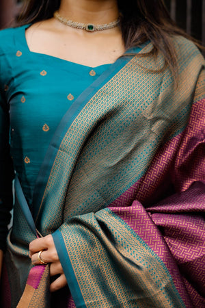 Paired with a green聽 colour semi kanchipuram silk trousers with functional pockets. Paired with beautiful purple colour 聽semi kanchipuram silk dupatta which has lavander zari detailing all over and tassels.