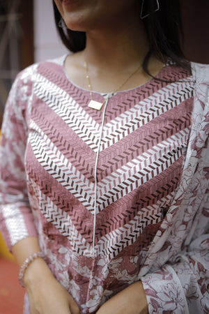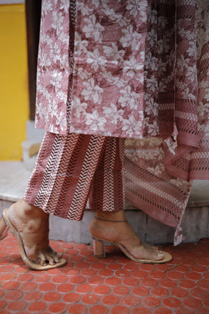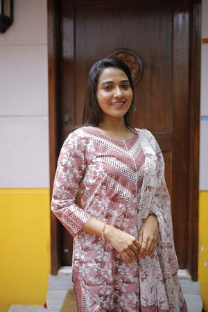 Rizwana - floral printed organic cotton suit set in onion pink & white